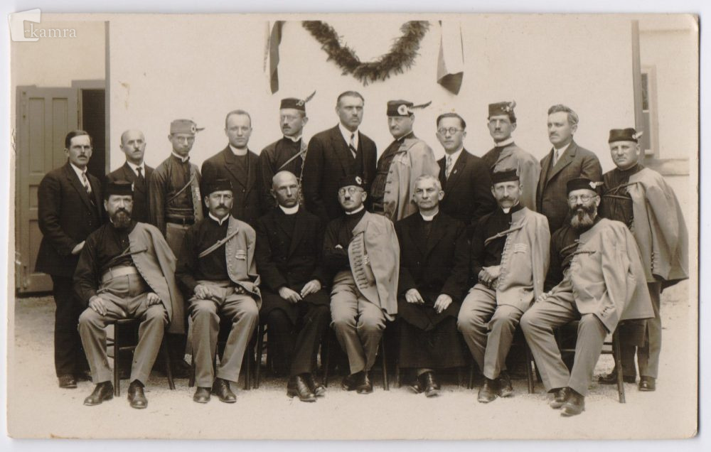 Med mnogimi še ne prepoznanimi osebami na fotografiji sta prepozna takratni celjski župan Alojz Mihelčič (1880-1975), ki sedi prve z leve, in g. Pišek, stoji prvi z leve. Po slednjem, ki je imel gostilno v Čretu pri Celju, je v ustnem izročilu poimenovano celjsko mestno pokopališče. Na delu zemljišča, kjer je sedaj pokopališče, naj bi g. Pišek prideloval zelenjavo. Fotograf: Franjo Kunšek, Celje