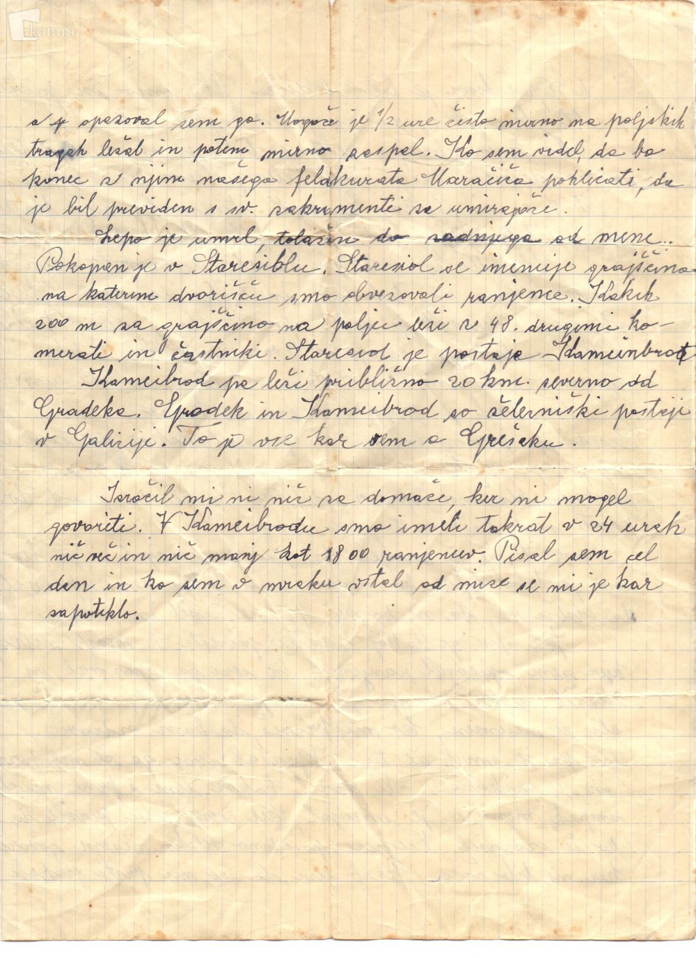 Pismo neznanega vojaka Grešakovim, 2. del Album Slovenije 22.05.2014 13:54 objavil Ivana Flander Pismo neznanega vojaka opisuje zadnje ure Janeza Grešaka z Breznega, ki je padel na galicijski fronti. Pismo se je ohranilo na kmetiji na Breznem, sv. Jedert (Sedraž) in ga hrani njegova nečakinja. Na fotografiji 2. del pisma. Slika FacebookXPinterestLinkedIn Natisni Natisni brez slik