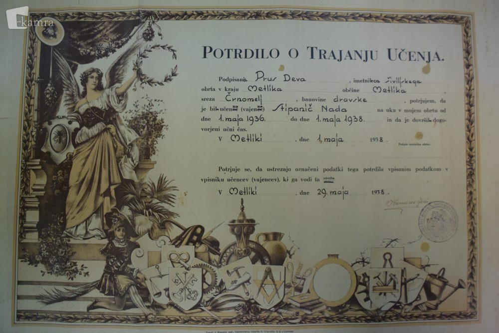Na fotografiji je listina, ki je služila kot potrdilo o opravljenem uku. Nada Stipanič je bila v času od 1. maja 1936 do 1. maja 1938 vajenka pri Devi Prus, šivilji. Potrdilo je izdala Zadruga vseh obrtnikov metliškega sodnega okraja. Na potrdilo je za zadrugo podpisana Jožica Kremesec. Potrdilo je bilo izdano 29. maja 1938.