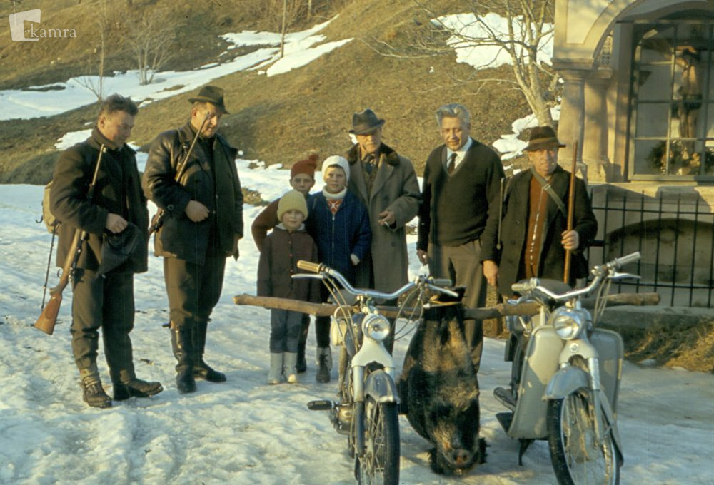 Poziranje z lovci po uspešnem lovu na divjega prašiča, ki je že pripravljen na transport z Tomosovima mopedoma v Gornjem Gradu spomladi 1966. Od leve proti desni: g. Dežman, neznan, Jure Šutej, Matjaž Tratnik, Gorazd Tratnik, Jože Tratnik, Tone Zagožen, g. Fricelj. Skeniran diapozitiv, avtor Zoran Tratnik