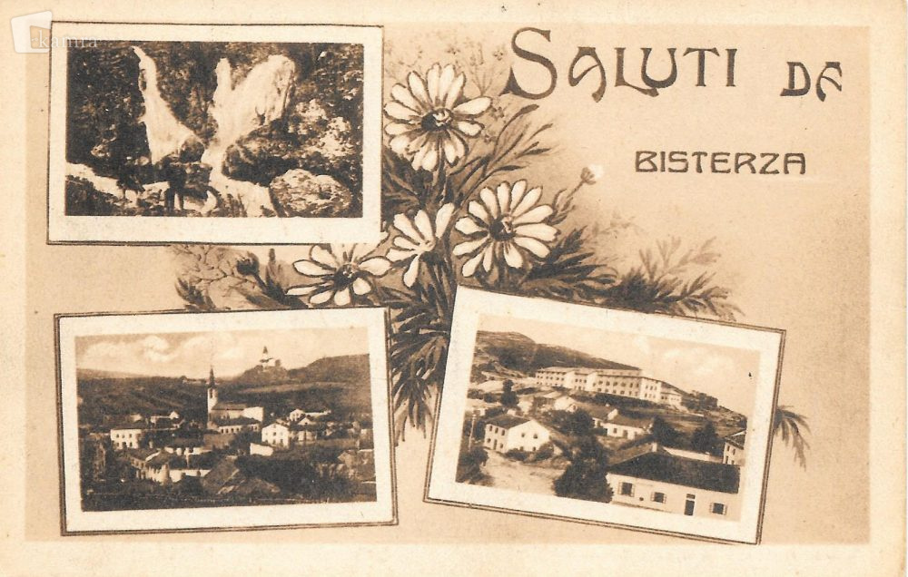 Na sliki: Ena lepih razglednic iz fotografske delavnice Stein Cadel, verjetno iz leta 1927 ali 1928, v času, ko je Ilirska Bistrica postala Villa del Nevoso. Na njej so znani motivi: slapovi Sušca, panorama kraja z obema cerkvama sv. Petra in sv. Jurija ter novimi vojašnicami nad Bistrico. V razglednico je vkomponiran še šopek poljskega cvetja. Vč/458
