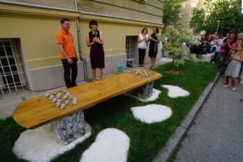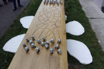 Iz neobdelane gmote (noge klopi so iz prešanega, odpadnega aluminija) prehajajo skozi leseno sedalo na površino glave, ki so simbol novih idej, misli, znanja, hkrati pa avtor simbolno govori o integraciji in spoštovanju drugačnosti ter odpravljanju omejitev, ki povzročajo nasprotja med ljudmi. Ime klopi je sestavljeno iz zlogov ali besed KAL (kaljenje), UM ali UMETNOST in ALUM kot aluminij.