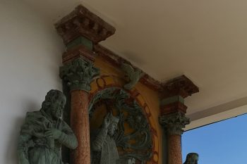 Zasnovana je preprosto in združuje zgolj tradicionalne sestavine. Pred fasado stoji lopa na štirih podpornih stebrih, do katere vodijo stopnice. S tega mesta so bile v kasnejših stoletjih večkrat nagovorjene množice romarjev in obiskovalcev, ki so se zbrale na travniku pod cerkvijo. Poleg daritvenega ima še šest oltarjev. Vsi stranski oltarji so kamniti, iz črnega marmorja, delo Cussovih naslednikov, narejeni v letih od 1736 do 1743. V cerkvi je križev pot, ki je preprosto ljudsko delo. V letu 2014 je bil v celoti restavriran pod strokovnim vodstvom restavratorke Nine Dorič Majdič in Leona Lavriča.