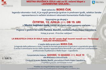 V vročini junijskega večera je Mestna knjižnica Izola gostila že 93. večerni klepet z »Zanimivimi Izolani«. Ker Izola slovi kot športno mesto, je bil temu primerno obarvan tudi tokratni večerni klepet. V čitalnici knjižnice se je z Natašo Benčič pogovarjal trener številnih generacij mladih, posvečenim rokometu, športni komentator na Radiu Koper, legenda izolskega rokometa – Boris Čuk.