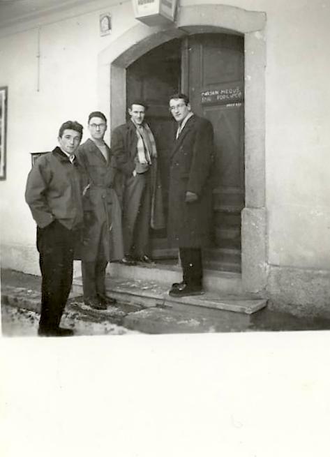 Štirje primorski študentje v Ljubljani, pred znamenito staro gostilno (1889) pod Rožnikom, ob eni izmed poti s študentskega naselja na Cankarjev vrh. Vpisani smo bili v različnih smereh, združeval pa nas je tedanji Klub Primorskih študentov in neuničljiva navezanost na Primorsko.