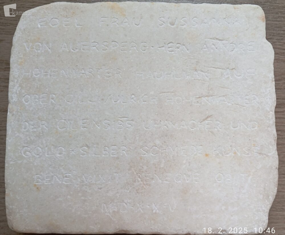 You are here: KamraAlbum of SloveniaOtherSrednjeveška obrt urarstva in zlatarstva na slovenskem, ena izmed prvih, v kamnito ploščo vklesanih omemb urarske in zlatarske obrti na Slovenskem, 1525, Celje, Glavni trg, Hohenwarter Andrej, (Ulrik) in njegova žena Suzana dekliško princesa Auersperg