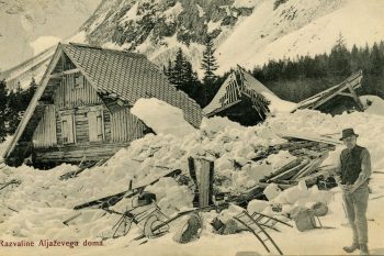 Aljažev dom, ki so ga na Vratih postavili leta 1904, je pet let pozneje podrl snežni plaz. Med ostanki ostrešja doma je sliki Janez Klinar – Požganc, gorski vodnik iz Mojstrane. Kot izkušen delovodja je bil nenadomestljiv sodelavec pri Aljaževih gradnjah v triglavskem pogorju: prvotni Aljažev in Triglavski dom, Staničevo zavetišče, Tominškova pot, pot čez Prag in na Mali Triglav ter izstrelitev nevarnih mest na grebenu med obema vrhovoma. (Foto: Bogumil Brinšek (1884-1914)