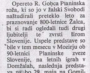 Savinjski vestnik 31. marca 1951 piše, da je dramska skupina KUD »Ivana Cankarja« »te dni« uprizorila Gobčevo Planinsko rožo.