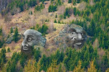 Tako sta velikana lomila vsak svojo pečino, jo klesala in obdelovala ter zidala vsak svoj grad. A preden sta bila oba gradova, vsak na svoji strani, zgrajena, sta se velikana sprla zaradi lova na divjad, ki jo je bilo vse manj, zato je lomski velikan kradoma lovil po Podbevški hosti. Ko ga je velikan s Podbeškovega naposled zasačil, ga je nagnal. Potlej sta se prepirala in zmerjala, da je po Zadrečki dolini in Črni dolini kar grmelo. Nazadnje sta se tako razbesnela, da sta začela rušiti vsak svoj grad in se obmetavati s skalami, skale pa so bile tako težke, da sta drug drugega ubila in njuni od skal poškodovani glavi sta ostali ujeti v skalah, vsaka na svoji strani prelaza.