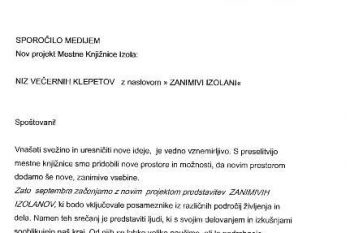 Predstavitve – sproščeni večerni klepeti – potekajo enkrat mesečno ob podpori Občine Izola in sponzorjev. Želja knjižnice je, da bi postale tradicionalne, saj je v kraju, kjer živimo veliko ustvarjalnih posameznikov, ki znanje in izkušnje delijo z vsemi, ki se predstavitev udeležijo, knjižnica pa se z njimi vključuje v vseživljenjsko učenje, ki je le ena izmed mnogih vsebin, zapisanih v poslanstvu te ustanove.