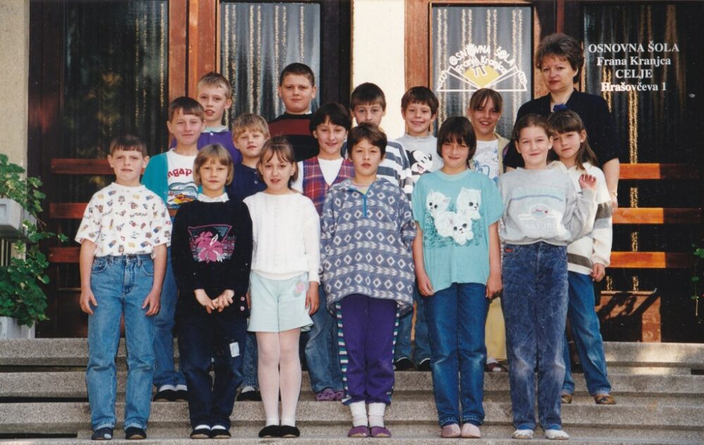 Tretja vrsta od leve proti desni: Dejan Plajnšek, Sašo Farčnik, Aleksander Štor, Jure Podergajs, Sabina Hriberšek, učiteljica Tatjana Oprešnik. (Mia Kočevar por. Zagoričnik, ustni vir)