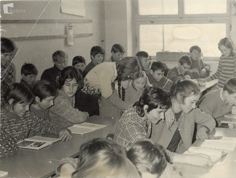 Ravnatelj Milan Gombač je fotografijo v Šolski kroniki 1971/72 podpisal z naslovom »Pretesna učilnica«, s čimer je želel poudariti, da šola potrebuje prizidek in več učilnic. V drugi klopi, tretja z leve, v učbenik gleda Adrijana Mlinarič; v zadnji vrsti se za njo smeji Jani Končan.