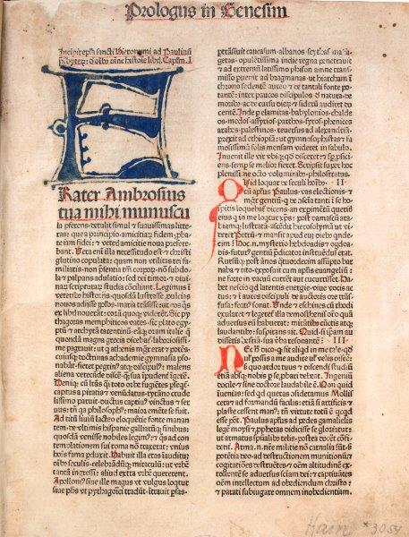 Biblia, 1475 - prva stran Multimedia element 25.11.2019 09:42 published by Knjižnica Ivana Potrča Ptuj Biblija, tako kot večina prvotiskov, nima naslovnega lista. Na začetku poglavij in odstavkov so ročni vrisane inicialke v modri in rdeči barvi. Photo FacebookXPinterestLinkedIn Natisni Natisni brez slik