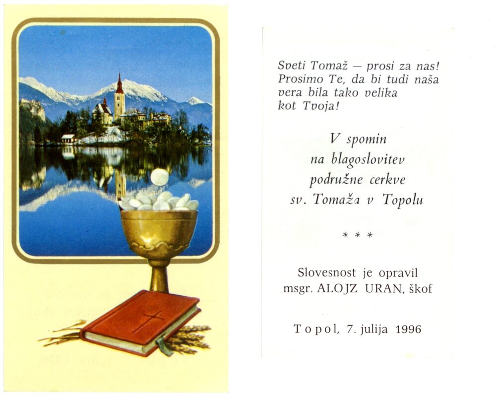 Blagoslovitev podružne cerkve sv. Tomaža v Topolu pri Begunjah, 1996 Multimedia element 16.10.2025 22:06 published by Knjižnica Jožeta Udoviča Cerknica Blagoslovitev podružne cerkve sv. Tomaža v Topolu pri Begunjah, 7. julij 1996. Cerkev Matere božje na Blejskem otoku, sveta evharistija. Mere: 6,4 x 11 cm. Zbirka družine Kranjec iz Topola pri Begunjah. Photo FacebookXPinterestLinkedIn Natisni Natisni brez slik