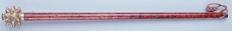 Medeninasto glavico prekriva sedemindvajset stožčastih izboklin. Na temenu je profiliran gumb. Ročaj je novejši.