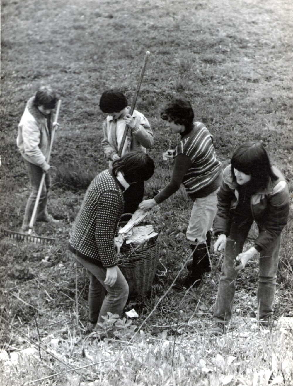 Avtor fotografije je Peter Verdev, letnik 1968, 8. razred. Vsako pomlad je pionirska šolska zadruga tradicionalno organizirala čistilno akcijo. Oddelčne skupnosti so čistile okolico šole. Delovna brigada je očistila Pelikanovo pot na Stari grad in sodelovala pri čiščenju okolja v krajevni skupnosti Pod gradom. Vir: Šolska kronika 1978-1991.