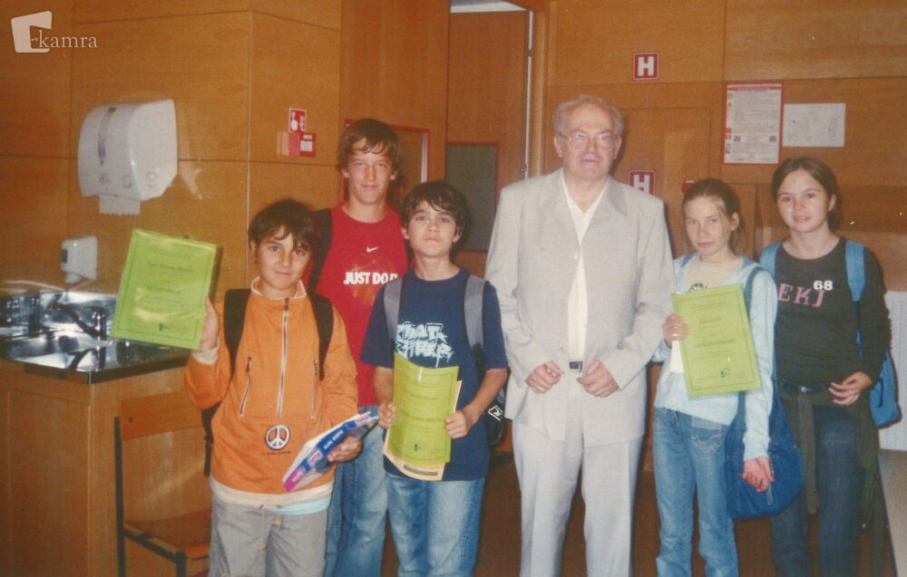 Od leve proti desni: Žiga Kotnik Klovar, Urban Ulrych, Jan Kotnik Klovar, Zala Zorko in Sara Košenina. Med učenci stoji dr. Izidor Hafner, profesor matematike in računalništva, ustanovitelj tekmovanj iz računalništva in logike ter revije Logika in razvedrilna matematika, upokojeni predavatelj na Fakulteti za računalništvo in informatiko v Ljubljani.