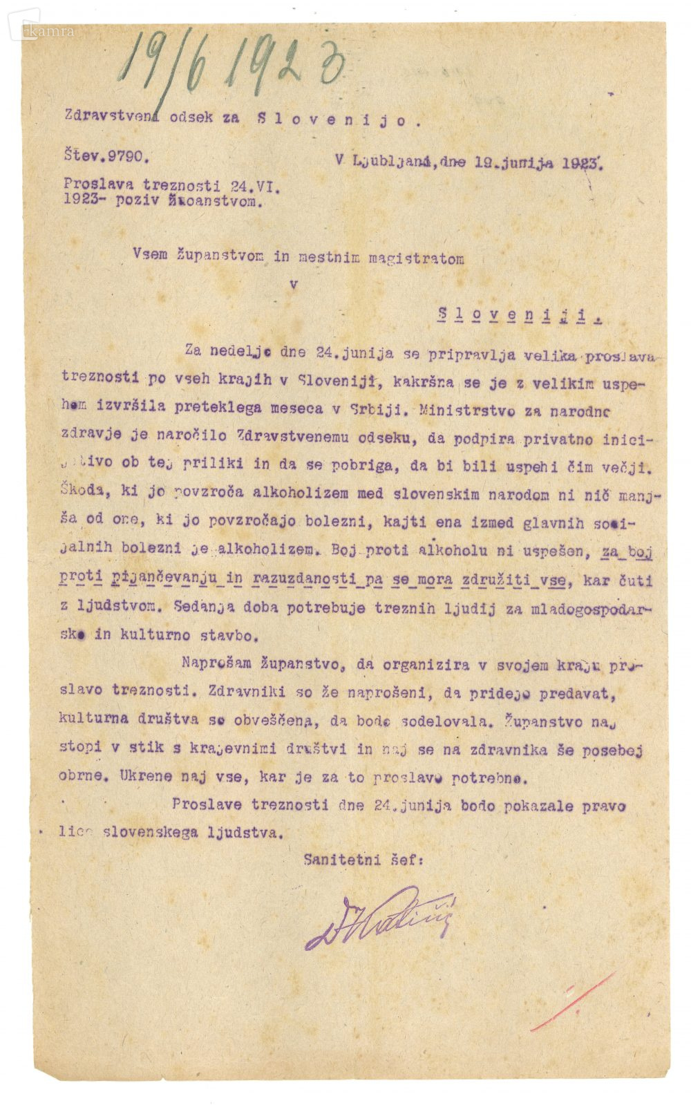 Proslava treznosti Multimedia element 20.06.2022 17:18 published by Mestna knjižnica Kranj Zdravstveni odsek za Slovenijo je leta 1923 županstvom poslal prošnjo, naj za omejevanje alkoholizma organizirajo »proslave treznosti«. Photo FacebookXPinterestLinkedIn Natisni Natisni brez slik