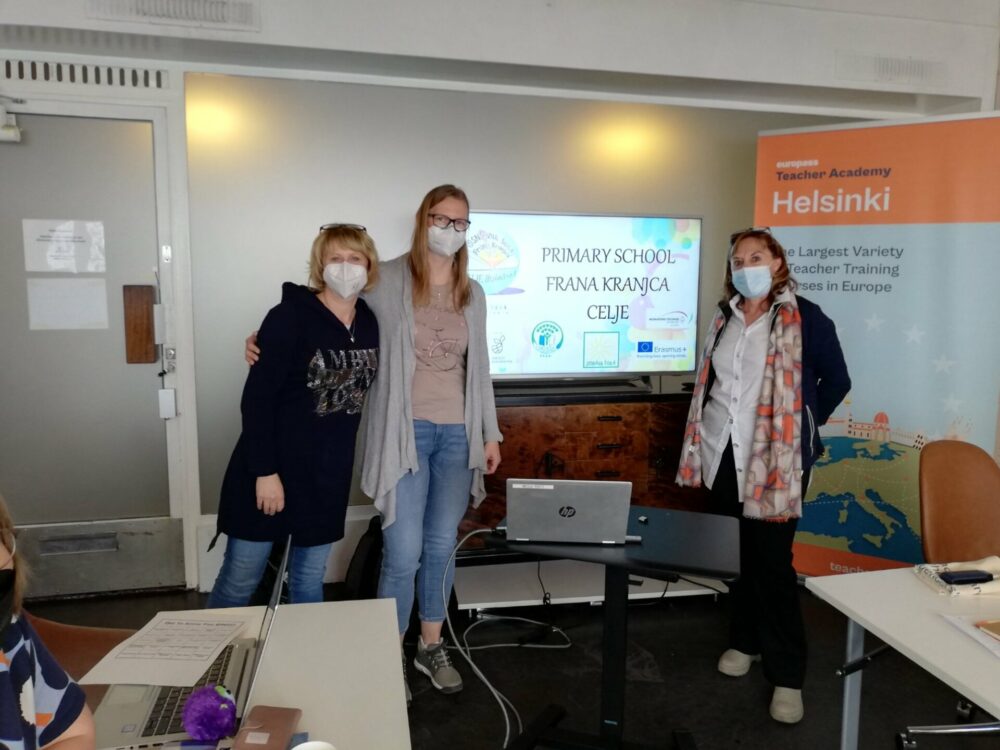 Na fotografiji so od leve proti desni učiteljice Darinka Čobec, Veronika Jelen Polak in Vlasta Prevolšek med predstavitvijo naše šole v Helsinkih.