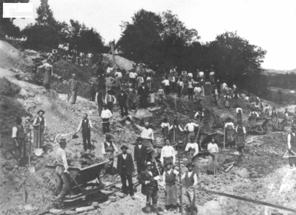 Fotografija prikazuje gradnjo proge preko Halerjevega Hriba, kjer sprva še ni bilo tunela.