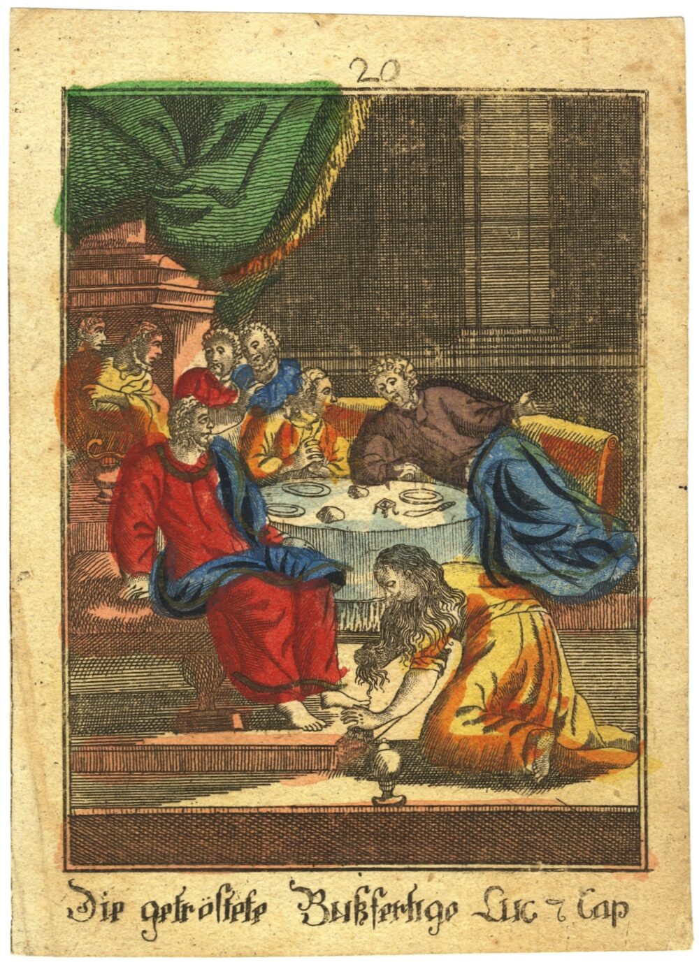 Grešna žena Multimedia element 16.10.2025 22:05 published by Knjižnica Jožeta Udoviča Cerknica Grešna žena, ki Jezusu s solzami moči noge, jih briše z lasmi, poljublja in mazili z dišečim oljem, Lk. Die getröstete Bußfertige (Potolaženi spokornik). Mere: 9 x 12,5 cm. Zbirka Slavke Ivačič z Rakeka. Photo FacebookXPinterestLinkedIn Natisni Natisni brez slik