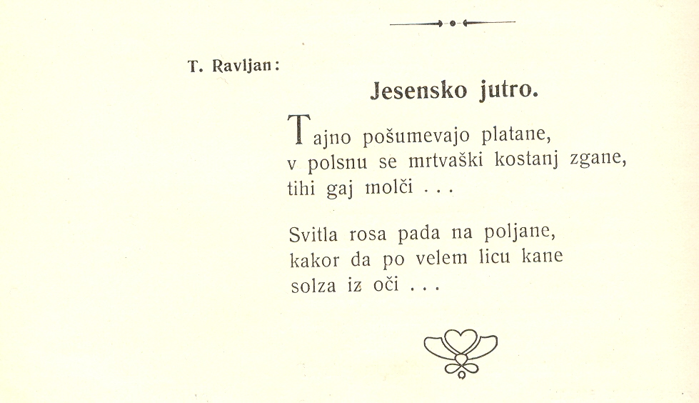Impresija Jesensko jutro Multimedia element 02.09.2019 08:18 published by Osrednja knjižnica Celje Drobna Ravljenova impresija Jesensko jutro je izšla leta 1916 v Ljubljanskem zvonu. Photo FacebookXPinterestLinkedIn Natisni Natisni brez slik
