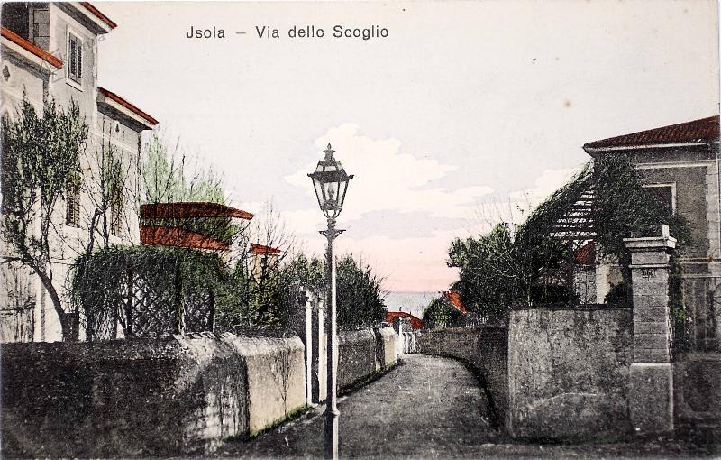 Razglednica ni bila poslana. Na zadnji strani je napis Cartolina Postale. Na razglednici je ulica z ulično svetilko, ob straneh zidovi pred hišami in stanovanjske hiše z zelenjem. Na levi in na desni sta na dvorišču pred hišo vrtni utici oziroma paviljona z zelenimi ovijalkami.