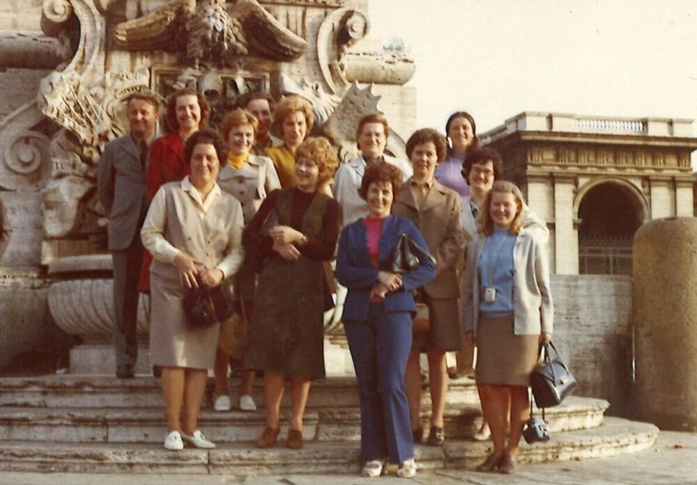 Spodnja vrsta od leve proti desni: Vladka Vizjak Rode, Milena Pečnik, Vera Zgoznik, Erika Bobnič (visoke postave, rjava frizura), Marija (Maja) Gerželj (moder pulover, blond daljši lasje), nad Marijo Gerželj je neprepoznana ženska z očali. (Milena Pečnik, ustni vir)