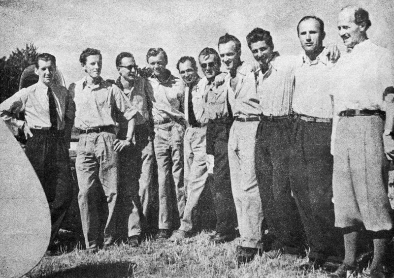 Jugoslovanska ekipa v Örebru 1950 – (z leve) Franc Šušteršič, Franc Mordej, Jaroslav Koser, Maks Arbeiter, Pavle Crnjanski, Milan Borišek, Jakšič, Mijo Pušič, Jovan Arežina, inž. Boris Cijan. (fotografija je bila objavljena na naslovnici v reviji Narodna krila, Časopis Vazduhoplovnog saveza Jugoslavije, avgust 1950)