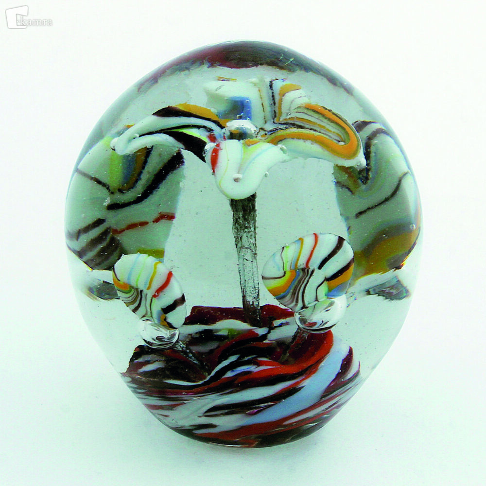 Hrastnik (1939 – 1950). Kroglast obtežilnik s povišano, skoraj konično kupolo. Štirilistni središčni cvet je iz prelivajočega belega, rumenega, modrega, rdečega in rjavega stekla. Mehurček v sredini prehaja v debel cvetni pecelj. Obdajajo ga štirje manjši enako obarvani cvetovi z ekscentrično postavljenimi mehurčki na zunanji strani cvetov. Podlaga, v katero se zabadajo cvetni peclji, je dvignjena v obliki hribčka. Izdelana je iz spiralno zavitih pasov raztaljenega stekla bele, rjave in rdeče barve. Baza je zelo ozka in ob robovih brušena. V = 92 mm,Š = 80 mm.