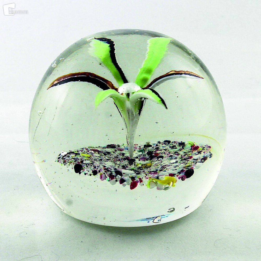 Pohorje (okoli leta 1900). Osrednji motiv kroglastega obtežilnika je cvet lilije s šestimi cvetnimi listi sestavljenimi iz trakov zelenega, belega, rjavega in oranžnega stekla. Cvetni listi so ob sredinskem mehurčku upognjeni proti podlagi v obliki rahlo vbočene blazine, ki je pokrita je z drobci pisanega stekla in lističi sljude. Baza je ravna in polirana. V = 70 mm, Š = 77 mm.