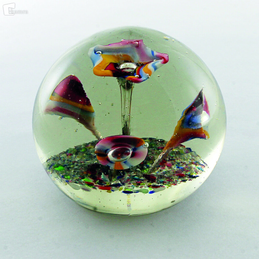 Kozjansko (po letu 1860). Majhen lično izdelan kroglast obtežilnik iz rahlo rjavkastega stekla. Sredinski cvet petkotne oblike in trije čašasti cvetovi okoli njega so iz prelivajočega rdečega, modrega, belega in oranžnega stekla. Pestiče predstavljajo ekspandirani mehurčki podaljšani v cvetne peclje. Podlaga (blazina) iz raznobarvnih drobcev stekla in steklenega prahu je na mestih stika s cvetnimi peclji rahlo upognjena proti bazi obtežilnika. Baza je ravna in polirana. V = 59 mm, Š = 63 mm.