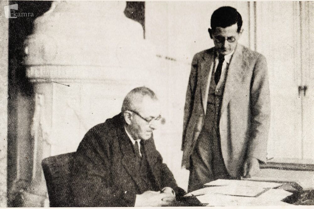 Slika: Murko sedi za mizo, ob njem stoji tajnik J. Svoboda.