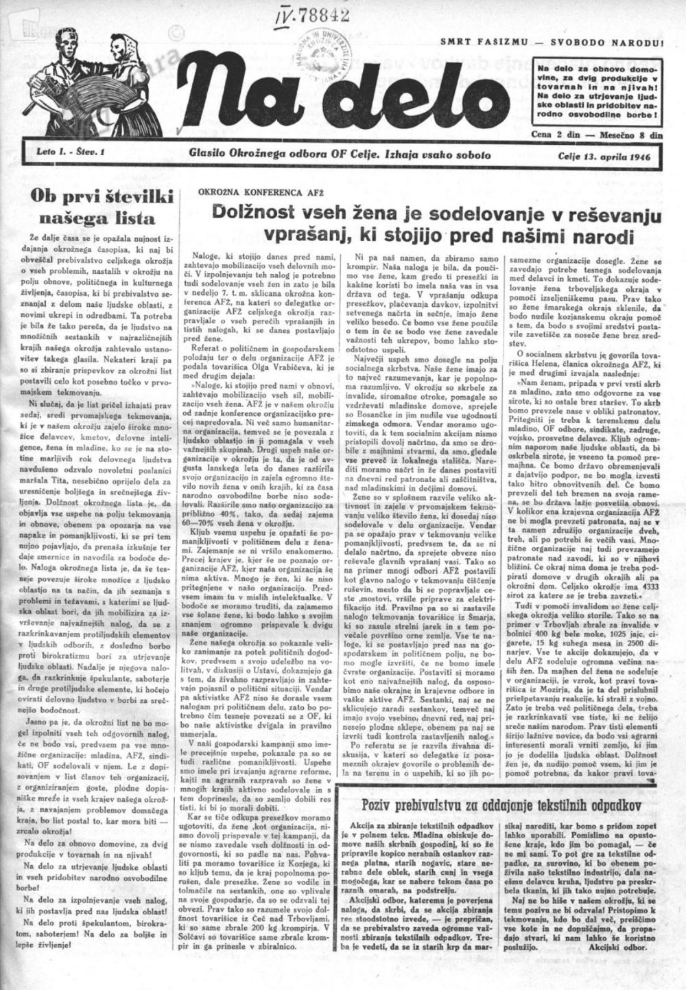 Naslovnica prve številke celjskega tednika Na delo (danes Novega tednika), ki je izšla 13. aprila 1946.