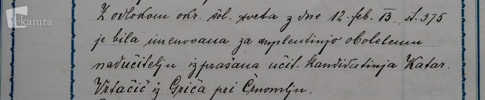 Odlok o namestitvi na OŠ Podzemelj Multimedia element 21.11.2019 09:13 published by Knjižnica Črnomelj Zapis iz Kronike OŠ Podzemelj o namestitvi Katarine Vrtačič (poročene Zupančič) na delovno mesto učiteljice. SI_ZAL_MET/0030, Osnovna šola Podzemelj, t. e. 1. Photo FacebookXPinterestLinkedIn Natisni Natisni brez slik