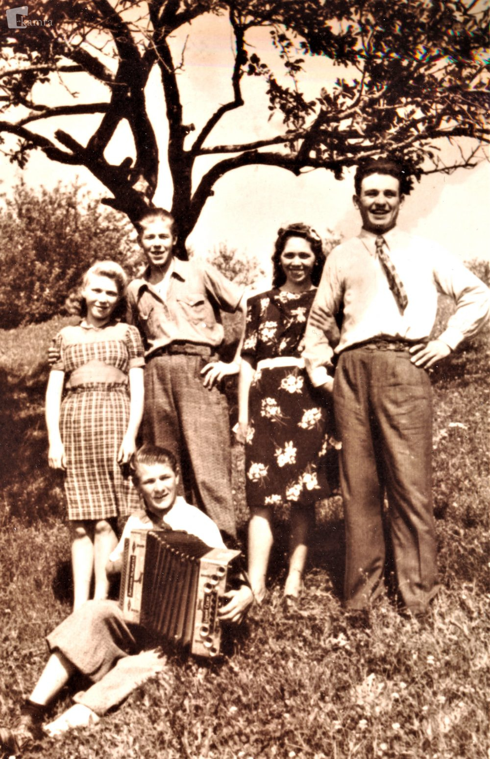 Na fotografiji so na dan mršanskega opasila Lovretovi Marija, Tone in Jože/Pepi s harmoniko, Olga Šimonova in Frane Betegarjev leta 1942. (Opasilo). Toni (skrajno desno) je umrl v taborišču Dachau, Pepi je bil kasneje ubit v vojni.