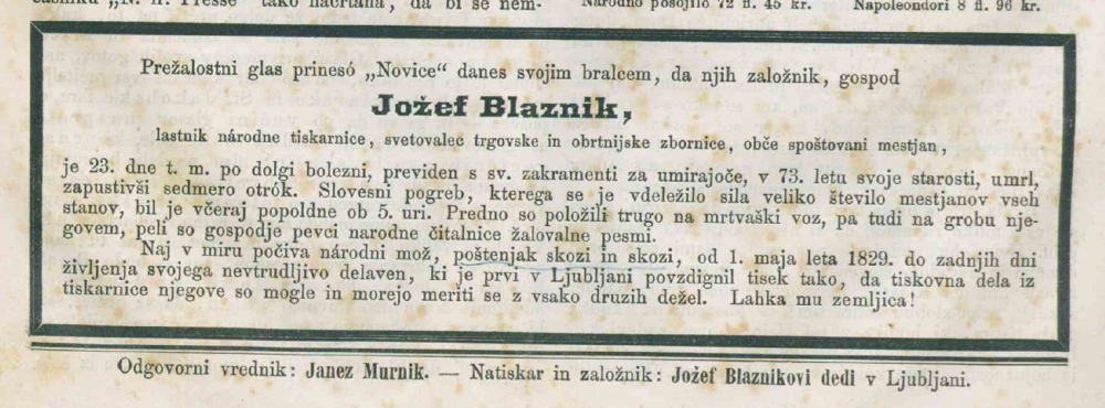 Osmrtnica za Jožefa Blaznika Multimedia element 31.12.2019 15:04 published by Mestna knjižnica Ljubljana Osmrtnica za pomembnim ljubljanskim tiskarjem. Photo FacebookXPinterestLinkedIn Natisni Natisni brez slik