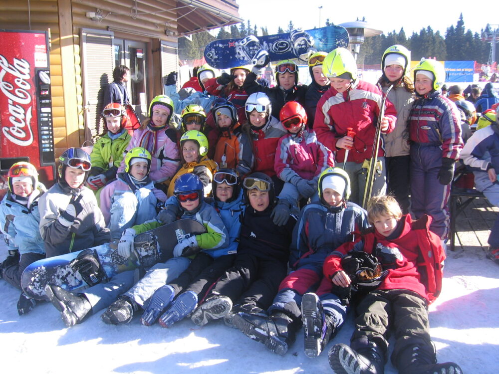 Udeleženci zimske šolske šole v naravi leta 2007. Zimske šole v naravi so se v CŠOD Gorenje udeležili učenci obeh 5. razredov. Tega leta so prvič imeli tudi skupino deskarjev, ostali pa so smučali. Razredničarka in spremljevalka je bila Marijana Đudarić, učiteljica angleščine. Foto: Metka Irgolič, ki je vedno bila pedagoški vodja zimskih šol v naravi. (Metka Irgolič, ustni vir)