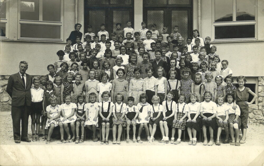 Drugo leto obratovanja šole. Šolski pevski zbor na fotografiji sta sestavljala kar 102 učenca. Na fotografiji je spodaj levo upravnik Franjo Čuk, levo zgoraj učiteljica Marija Hrabalek. Učiteljica zgoraj desno ni bila prepoznana. Franjo Čuk je do leta 1955 učil na šoli v Teharjah od koder je bil doma. Bil je zelo toleranten učitelj in vedno urejen. Učil je glasbo, v glasbeni sobi je igral na klavir. Tekoče je govoril italijansko. Imel je fotoaparat znamke WERRA 1 nemške proizvodnje s katerim je bilo mogoče narediti 6 posnetkov. Učenca, ki je bil izbran za tedensko najboljšega, je za »nagrado« s skuterjem znamke »Lambretta« odpeljal domov. To je bila za učenca največja čast. Čuka je posnemal katehet Žagar, ki je s svojim skuterjem Puch 125 Roller vozil domov učence, ki so bili najboljši pri verouku. (Dušan Selšek, ustni vir)