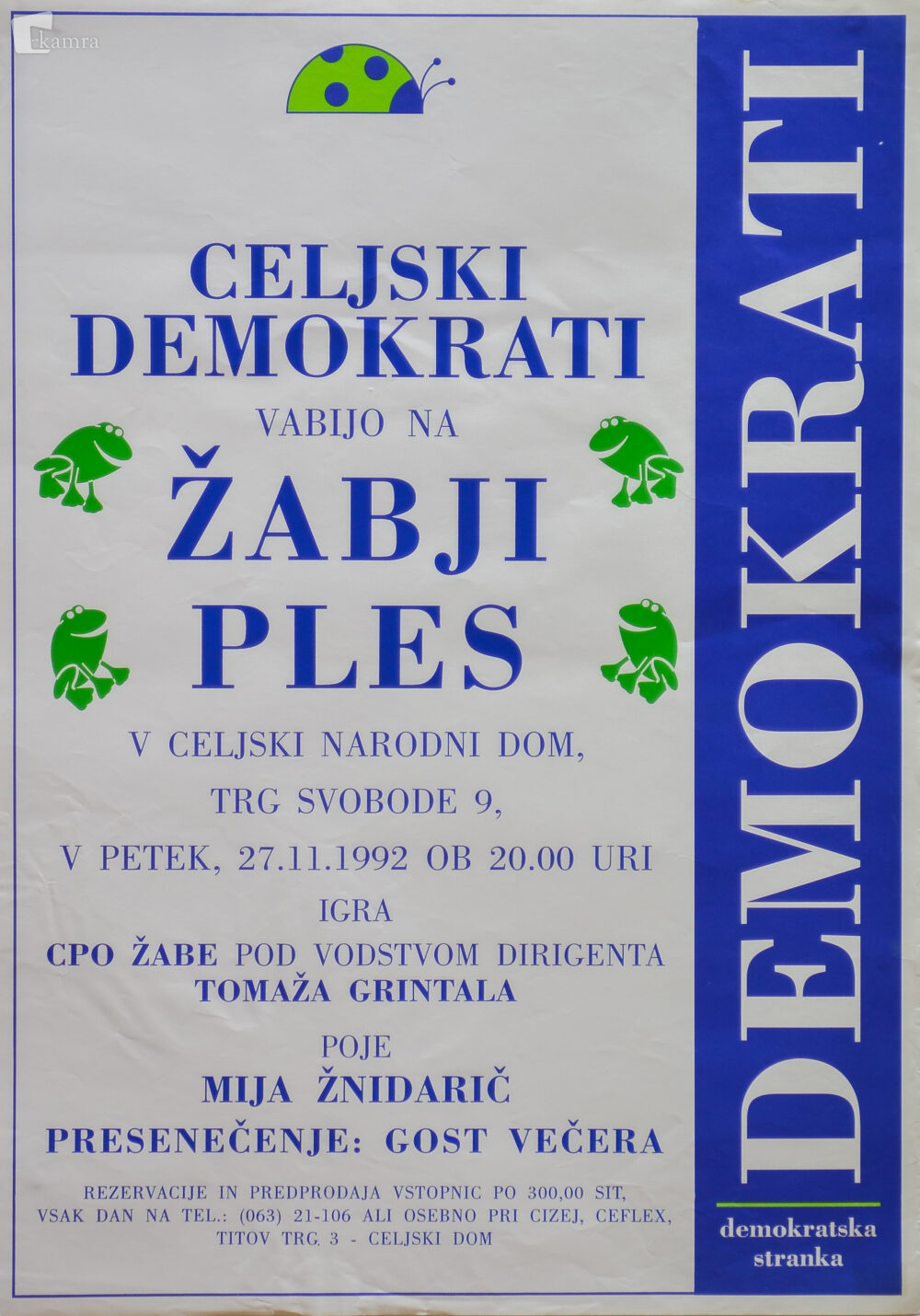 Plakat: Vabilo na Žabji ples Multimedia element 28.01.2026 12:49 published by Osrednja knjižnica Celje Celjski demokrati vabijo na Žabji ples, 1992. 68 x 48 cm. Photo FacebookXPinterestLinkedIn Natisni Natisni brez slik