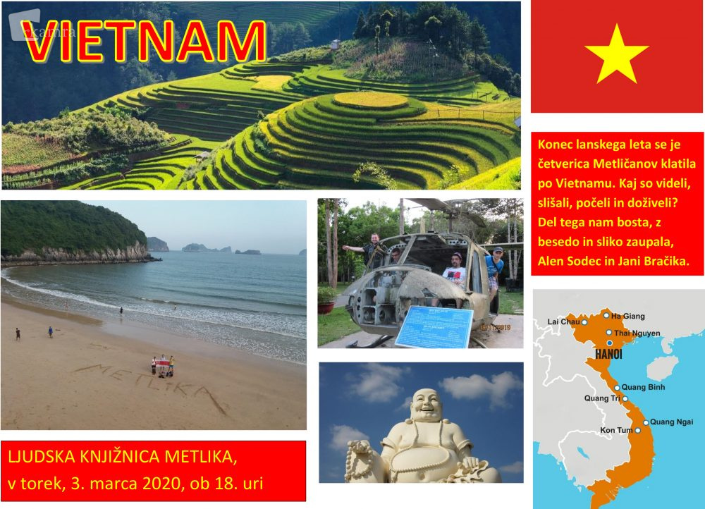 Potopisno predavanje - Vietnam Multimedia element 13.04.2023 11:48 published by Ljudska knjižnica Metlika Četverica Metličanov je bila novembra 2019 na potepanju po Vietnamu. Svoje izkušnje sta Janko Bračika in Alen Sodec zaupala zbranim v metliškem Kulturnem domu. Photo Hrbtna stran FacebookXPinterestLinkedIn Natisni Natisni brez slik