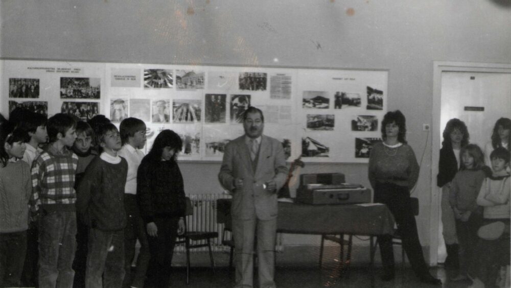 Na fotografiji levo od vrat stoji učiteljica glasbe in zborovodkinja Jolanda Ipšek por. Ulrych. Pri vratih takratne zbornice stoji učiteljica RP Lilijana (Lidija) Hrušovar (z očali). V ospredju je osrednji govornik na prireditvi. Levo stojijo učenci šolskega pevskega zbora. S šolskim pevskim zborom so nastopali v celjskih podjetjih, kjer so prepevali ob praznikih. Učenci – pevci so na prireditve s Polul hodili peš. Spremstev – dodatnih učiteljev ni bilo. Ko je Emil Lenarčič, ki je bil Jolandin učitelj glasbe na OŠ Polule leta 1985 odšel na OŠ Hudinja, je ravnatelj Milan Gombač službo ponudil mladi učiteljici in bivši učenki Jolandi Ipšek. Na šoli je poučevala od 1. 9. 1985 do 31. 8. 1993. Na predmetni stopnji je učila glasbeno vzgojo in vodila oba pevska zbora (OPZ in MPZ). (Jolanda Ipšek por. Ulrych, ustni vir)