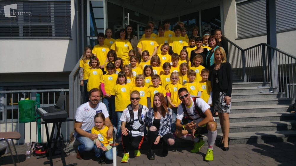Udeleženci prireditve: učiteljici Mateja Lajh in Kristina Radoš Janežič, ravnateljica Danica Šalej, celjska podžupanja mag. Darja Turk, ultramaratonca Anže Česen in Sonja Leskovar s hčerko Anais, ustanovitelj fundacije Beli golob Gianni Rijavec ter otroški pevski zbor šole.
