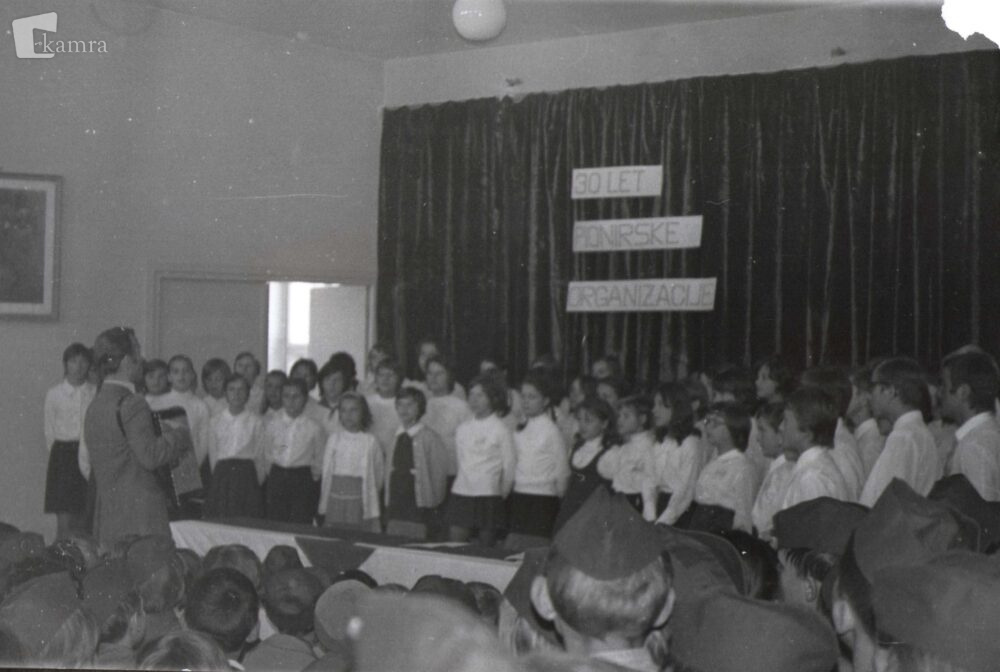 Harmonikar in zborovodja na fotografiji je Emil Lenarčič. Pionirski odred se je imenoval po narodnem heroju Tonetu Grčarju. Vsak odred je imel svoj prapor (zastavo).