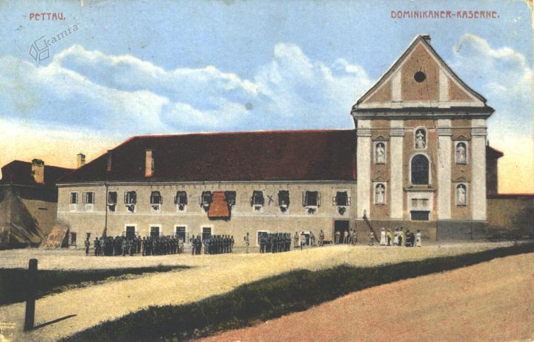 Razglednica predstavlja dominikanski samostan na Ptuju v začetku 20. stol., ko je bila v njem še vojašnica. Na dvorišču pred stavbo stojijo vojaki Avstro-ogrske vojske, desno pa skupina civilistov. Leta 1928 so samostan preuredili v muzej.