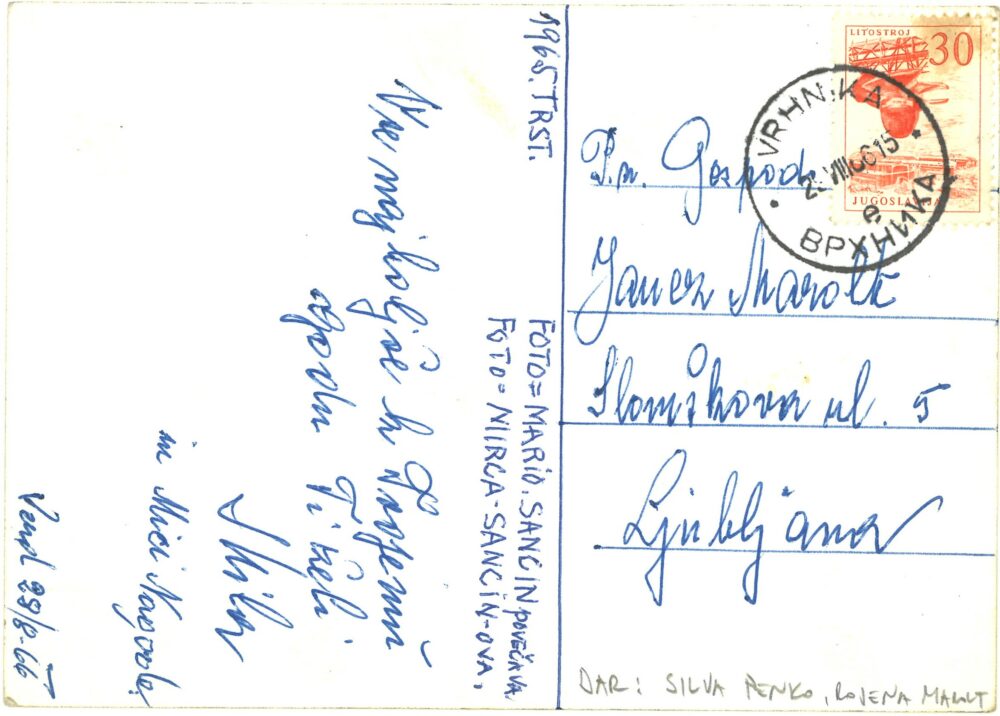 Razglednica Maroltovine, 1965 - hrbtna stran Multimedia element 13.10.2025 13:13 published by Cankarjeva knjižnica Vrhnika Da so bili tudi otroci Ane Petrič, poročene Župnek navezani na mamin dom v Verdu, priča ta, unikatno ustvarjena, razglednica. Fotografijo Mirce, je povečal njen sin Mario. Photo FacebookXPinterestLinkedIn Natisni Natisni brez slik