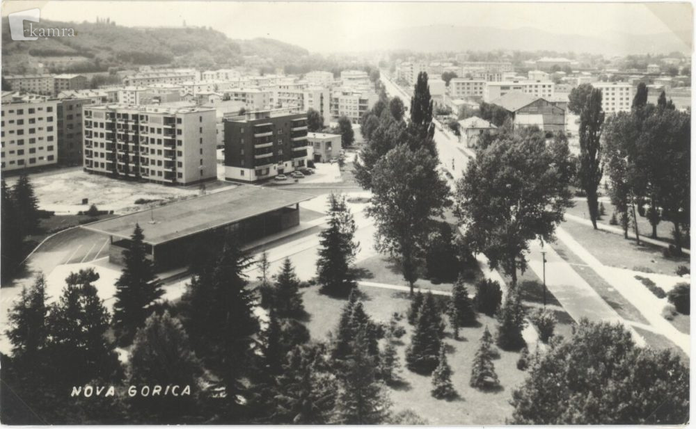 Predloga za to razglednico z avtobusno postajo v ospredju je bila očitno posneta iz nebotičnika v gradnji in pred postavitvijo Rusjanovega spomenika, ki ga na desni strani še ni, pa tudi cesta do križišča z Delpinovo še ni docela oblikovana. Foto in založba je Fotolik Celje, razglednica je bila maja 1961 odposlana v Grgar.