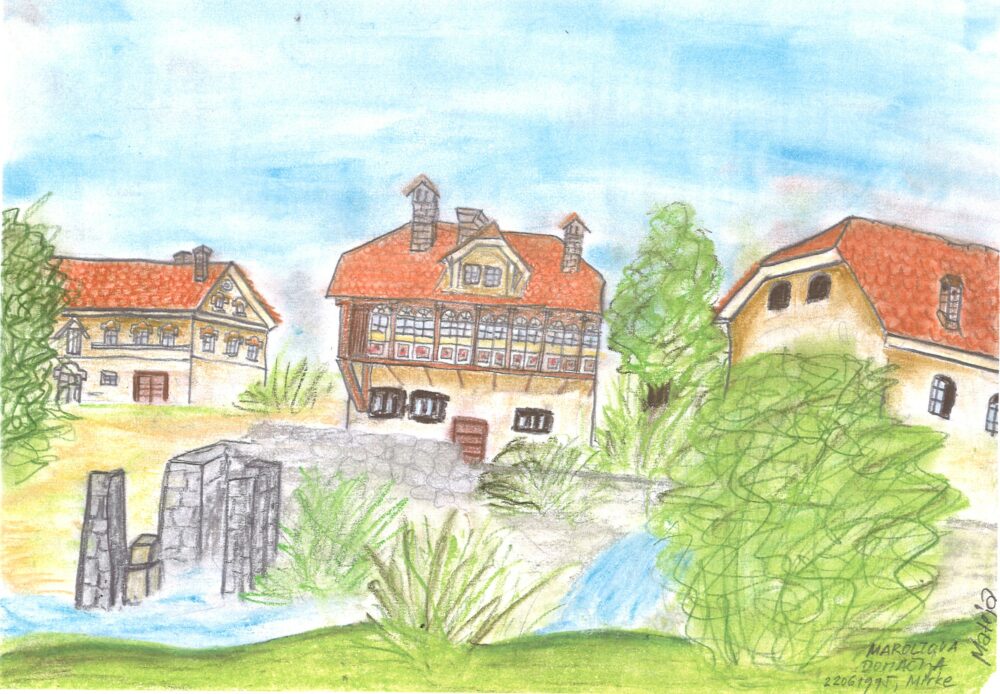 Udeleženka raziskovalnega tabora Mateja Dominko je junija 1995 narisala ta prizor z mirške strani Ljubljanice: na levi gospodarsko poslopje, v sredini stanovanjska hiša z umetelno zastekljenim balkonom, na desni magazin. Nad Ljubljanico kamniti stebri ter ostanki zidov žage in mlina.