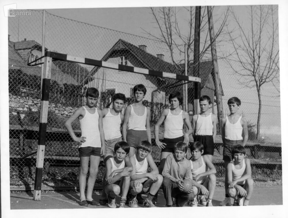 Čepijo od leve proti desni: Andrej Čečko, Slobodan Letić, Branko Kopinšek (z žogo), neznana oseba, Ivan Pišek.