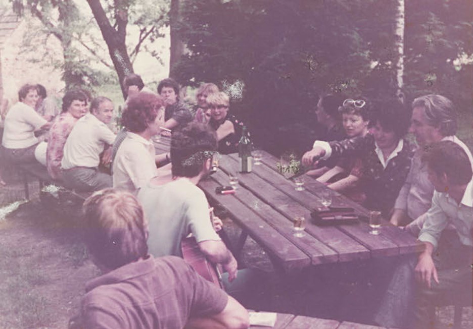 Od desne proti levi (fotografirani v hrbet): neznan moški, Miro Ulrych (s kitaro), Suzana Strohmaier (s cigareto), neznan moški v beli srajci (morda mož gospe Marije Križnik), Marija Križnik (kuharica), Ivanka Simon (v beli bluzi, nasmejana).